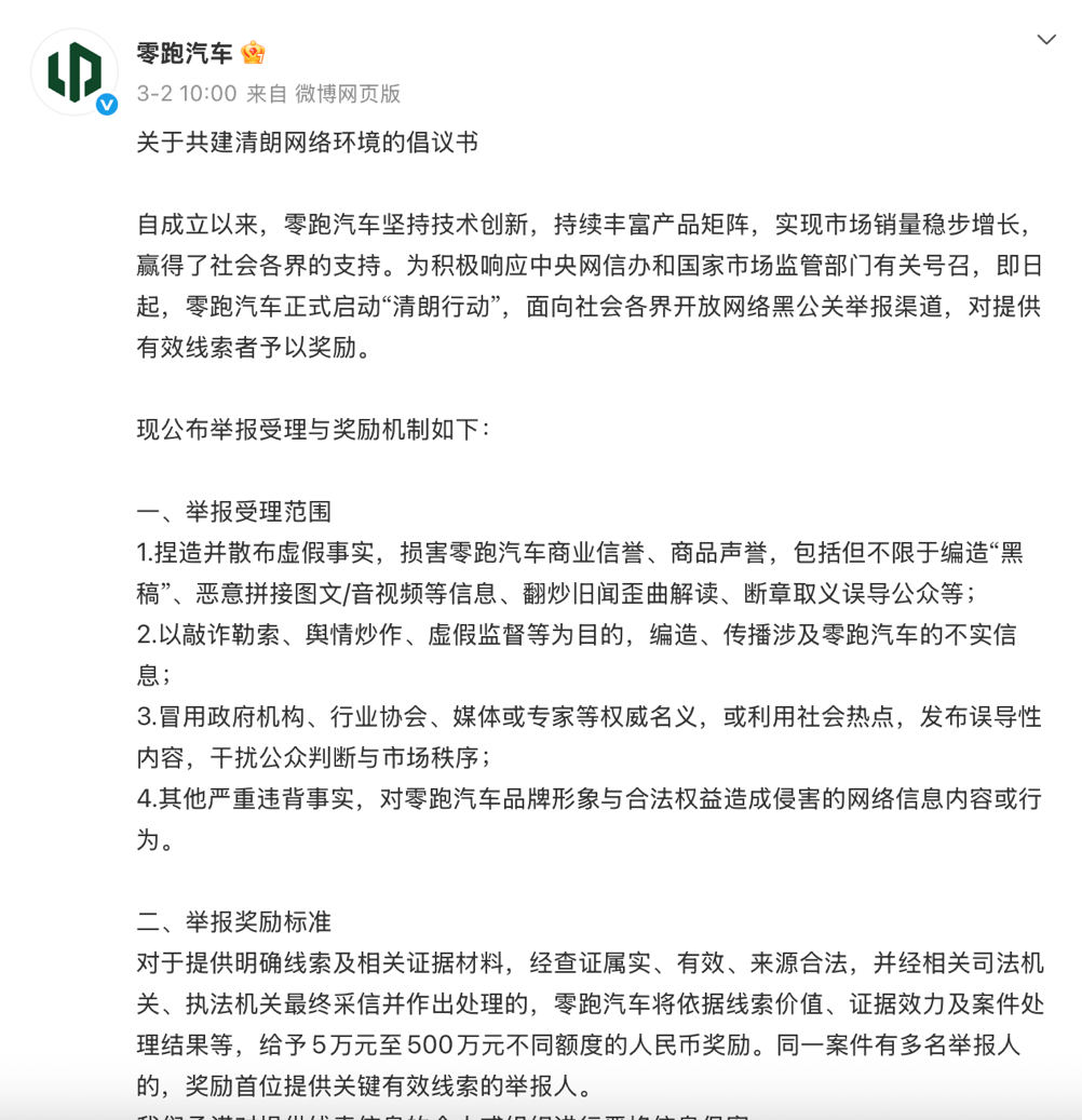 3月初,零跑汽车发布“清朗行动”倡议书,面向全社会悬赏黑公关线索,奖金最高500万元。