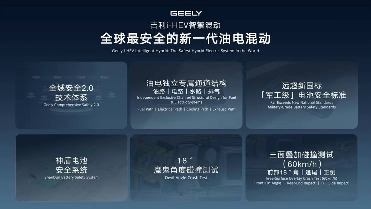 i-HEV智擎混动基于吉利全域安全2.0技术体系赋能打造,从整车开发源头就针对电路、油路、水路以及排气规划了独立的专属通道,从最基础的结构层面保障油电安全。